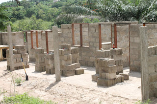 Even een tijdje stilte, helaas, maar soms werkt niet alles mee zoals we graag willen! Dan valt de stroom weer eens uit, dan is het internetcafe gesloten, dan valt de regen weer met bakken uit de lucht....maarrr hier zijn we weer! Donderdag zijn we verder gegaan met de bouw, alles is nu mooi op hoogte, de kozijnen staan allemaal en het beton voor de kolommen kan worden gestort. Jaap en Fokke zijn nog steeds dapper bezig met het plaatsen van dakgoten en regenpijpen en de dames houden zich bezig met het buitenmeubilair in de verf te zetten, het ziet er weer stukken frisser uit! Maar na al dat gezwoeg in de hitte, het is vaak 40 graden, hebben we vrijdag een vrij weekend. We gaan op weg naar Mole National Park, we hebben er zin in! De taxirit gaat de eerste uren vrij relaxed, maar de laatste 2 uur is een ware beproeving. Arme asssen, arme schokbrekers, arme achterwerken! Maar het is allemaal de moeite waard, we zitten in een prachtig park op een heuvel, met zwembad en prachtig uitzicht. De wrattenzwijnen voelen zich ook gelijk thuis bij ons, want ze wandelen nog net niet mee naar binnen! De volgende dag moeten we om 7 uur klaar staan voor de safari te voet. Helaas hebben de olifanten belangrijkere zaken te doen, het is namelijk mating season! We snappen dat de prioriteiten anders liggen maar jammer is het wel! We hebben een ervaren gids, met geweer, dat is wel een veilig idee. We dachten dat we gewoon over paden zouden lopen, nou nee dus, hup het struikgewas in, oke, dan doen we dat! We zien bushbucks, antilopn en bavianen en een hol van een groot stekelvarken. Helaas helaas, komt er een inktzwarte lucht opzetten, en maar even of het begon te hozen. We gingen toen maar eerst ontbijten en we vervolgden de tocht toen het weer droog werd. Het was nogal een zompige toestand, het liep ons geregeld over de schoenen. Door olifantengras, manshoog, langs olifantenpoep, dat dan weer wel en ook trapten we nog bijna een krokodil op zijn staart, we schrokken ons een ongeluk, zo dichtbij. Ook de gids was daar niet op bedacht, maar behield zijn afrkaanse kalmte. Gelukkig maar! Toen bleek een achtergebleven olifant toch recent in de buurt te zijn geweest, dus opnieuw op zoek naar deze zwaargewicht, we zijn er bijna volgens Isa, de gids. Maar toch moesten we terugkeren zonder Dombo te hebben gespot, beetje jammer. In de middag konden we even bijkomen van al die belevenissen in het zwembad, heerlijk! Ook nog eens lekker gegeten! De volgende dag konden we weer in de taxibus terug, weer al hotsebotsend over de zandwegen, wat een belevenis weer. We konden even aan de kant van de weg de benen strekken, helaas weer pal voor een bijennest, waarom ook niet. En prompt werd Leonie natuurlijk gestoken, in haar nek nog wel, pijnlijk. Om half drie zondagmiddag waren we weer thuis op PCC, uitgeteld en heel erg toe aan een koude douche, want in het hotel in Mole werkten deze niet, ach ja. Dat je zelfs dan blij kunt zijn met een koude douche, je leert wel relativeren hier. Vandaag zijn we weer verder gegaan met verven en beton storten voor de pilaren. Vanmiddag nog een rondleiding gehad door het ziekenhuis, bijzonder zullen we maar zeggen......! Maar wel heel interessant. We hopen alleen niet dat we er gebruik van hoeven te maken de laatste dagen haha! Verder krijgt het thuisfront nog even de groeten van ons allemaal, en in het bijzonder Tessa Meier, die vandaag 21 jaar is geworden en het moet vieren zonder moeder en broer, Tes, gefeliciteerd van ons allemaal!! Tot zover onze belevenissen van de laatste dagen.....